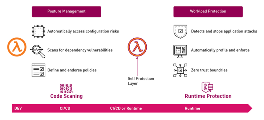 보안 강화, runtime code 분석, Web 및 API 보안을 포함한 workload 보호를 통해 zero trust, 지능형 위협 방지 제공