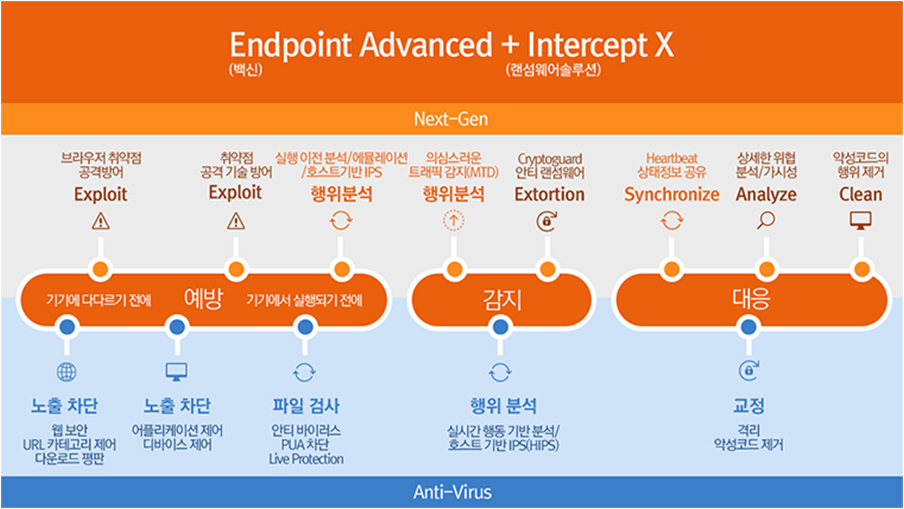 Sophos Intercept-X 는 어플리케이션의 취약점을 이용하여 삽입되는 악성코드의 행위를 분석하여 이를 사전에 차단합니다.